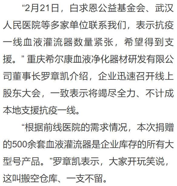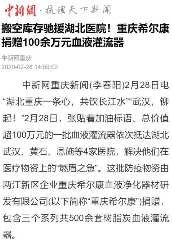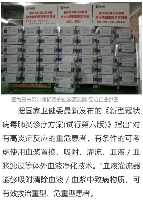 搬空库存驰援湖北医院!重庆希尔康捐赠100余万元血液灌流器
