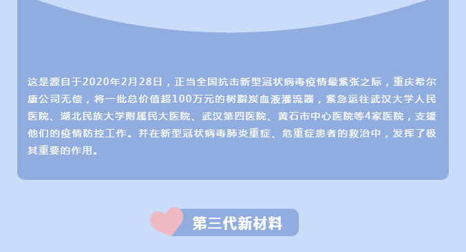 血液净化器材技术领域实现了与世界的同步和接轨 Blood purification equipment technical field To achievesynchronization and integration with the world 企业资讯学术专题健康宣教视频与文档 > 媒体中心 > 企业资讯 战“新冠”,树脂炭来加油! 发布时间:2020-04-08 发布:希尔康 联系我们: 服务热线:4008-110-978 联系电话:023-67505445/6 E-Mail:xek@cqxek.com 网址:www.cqxek.com 上一篇 希尔康公司又获得一项国家发明专利 返回列表 下一篇 “战新冠,用你的镜头夺冠”评选结果