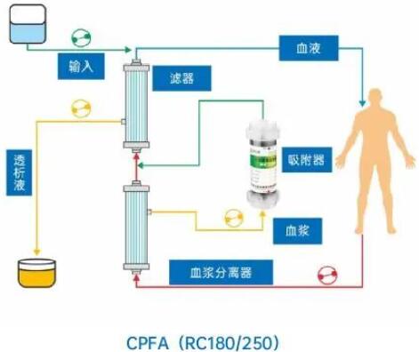 CPFA是指将全血进行血浆分离后再进行吸附治疗,对细胞因子和内毒素具有加强吸附的作用,吸附后的血浆可再通过透析滤器后返回患者体内,以进一步去除溶质和液体。