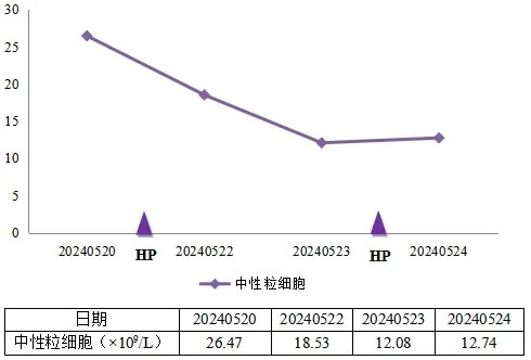患者中性粒细胞计数在CRRT+HP+ECMO治疗过程中显著下降。