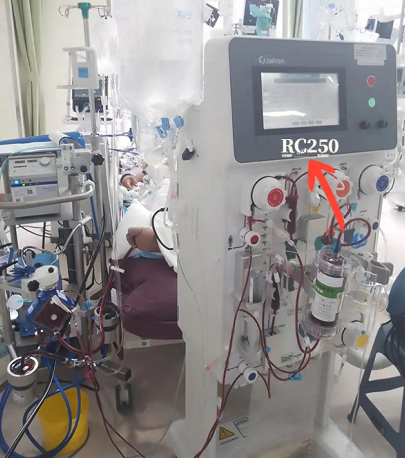 2、血液净化治疗:CRRT+HP+ECMO(一方面纠正酸碱、容量平衡以及清除血中炎症因子,另一方面给予呼吸支持)。CRRT和ECMO为连续治疗,HP(希尔康RC250)2小时治疗,共2次,1次/天。